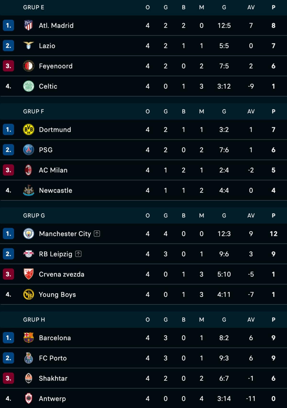 Avrupa futbolunun kulüp düzeyindeki 1 numaralı organizasyonu UEFA Şampiyonlar Ligi'nde E, F, G ve H gruplarında dördüncü maçlar oynandı.