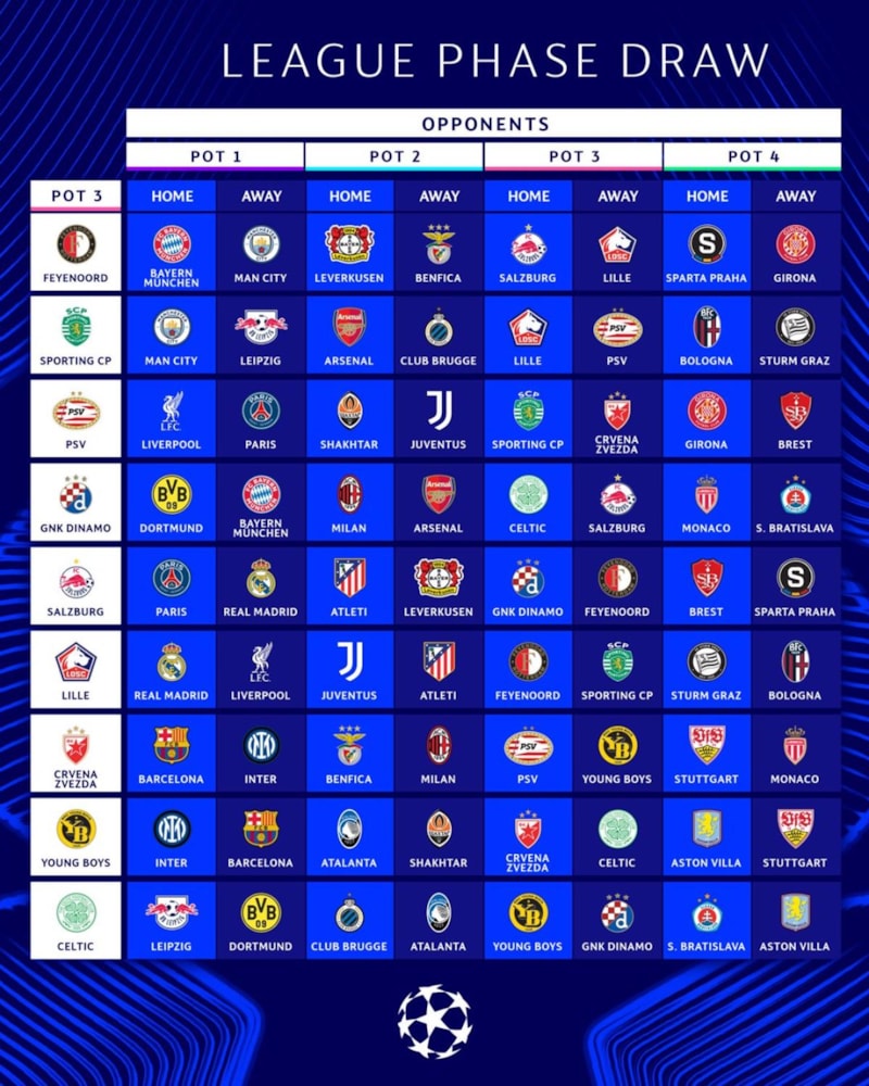 Takımlar her torbadan 2'şer takımla eşleşmek üzere 4'ü evinde 4'ü deplasmanda toplam 8 maç oynayacak.