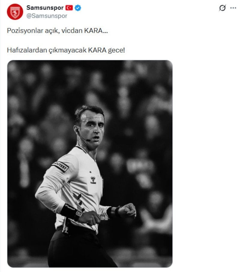 Samsunspor, sosyal medya hesabından kupadaki Trabzonspor maçının ardından hakem Atilla Karaoğlu için "Pozisyonlar açık, vicdan KARA.. Hafızalardan çıkmayacak KARA gece!" paylaşımında bulundu.
