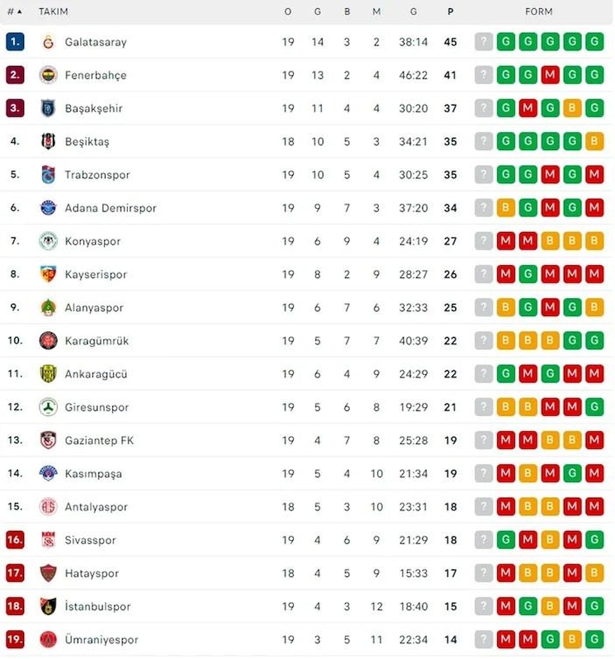 Süper Lig 20. hafta puan durumu