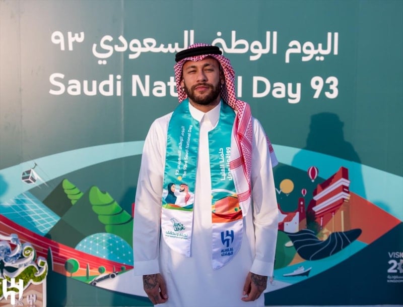 Suudi Arabistan'a transfer olan dünyaca ünlü yıldızlar, ülkenin kurtuluş günü etkinlikleri kapsamında yöresel kıyafetler giyerek kılıçla pozlar verdi.