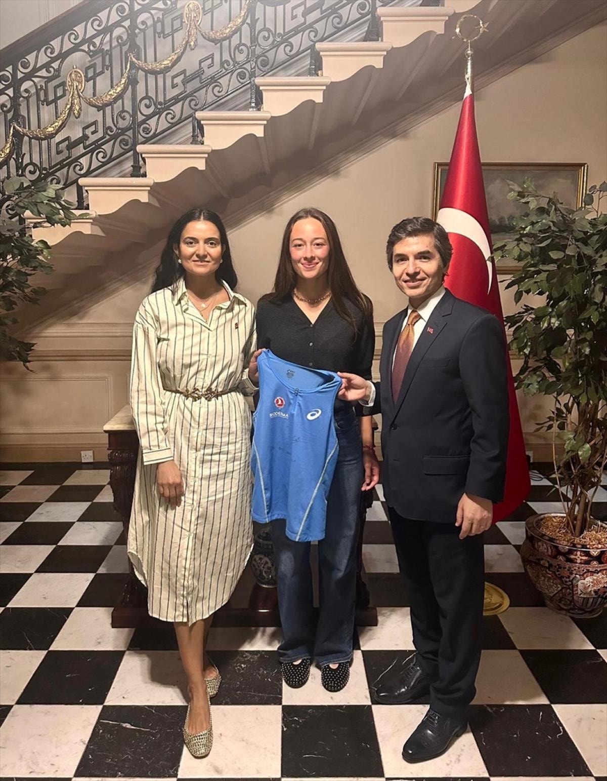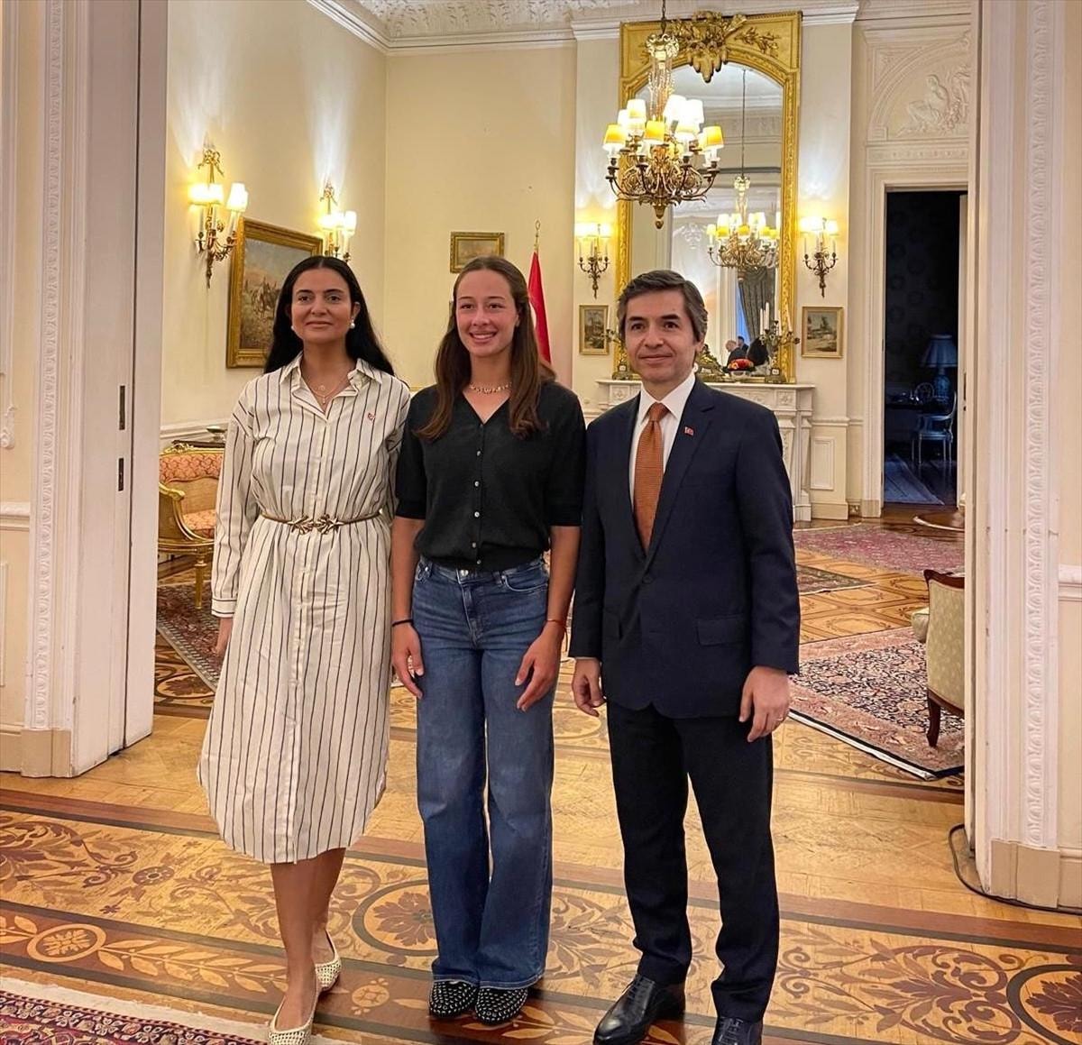 Wimbledon'da tarih yazan milli sporcu Zeynep Sönmez, Büyükelçi Ertaş ve eşi Sevcan Ertaş'a imzalı formasını hediye etti. Buluşmaya, TTF Başkanı Şafak Müderrisgil de katıldı.