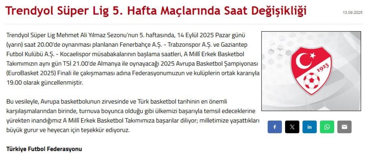 Trendyol Süper Lig Mehmet Ali Yılmaz Sezonu'nun 5. haftasında, 14 Eylül 2025 Pazar günü (yarın) saat 20.00'de oynanması planlanan Fenerbahçe A.Ş. - Trabzonspor A.Ş. ve Gaziantep Futbol Kulübü A.Ş. - Kocaelispor müsabakalarının başlama saatleri, A Millî Erkek Basketbol Takımımızın aynı gün TSİ 21.00'de Almanya ile oynayacağı 2025 Avrupa Basketbol Şampiyonası (EuroBasket 2025) Finali ile çakışmaması adına Federasyonumuzun ve kulüplerin ortak kararıyla 19.00 olarak güncellenmiştir.
