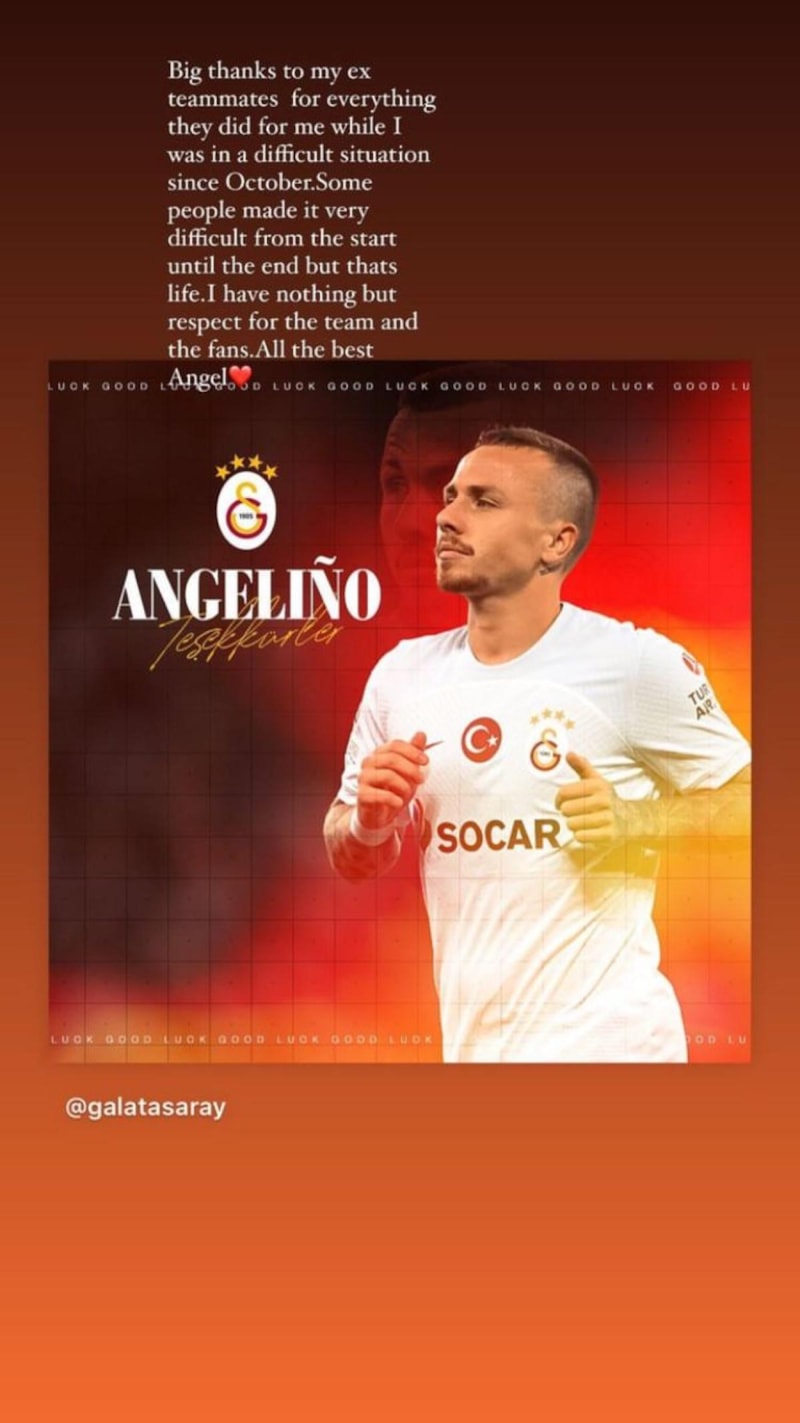 Galatasaray'dan ayrılarak Roma'ya 5 milyon euro satın alma opsiyonuyla transfer olan Angelino, dikkat çeken bir veda paylaşımında bulundu.