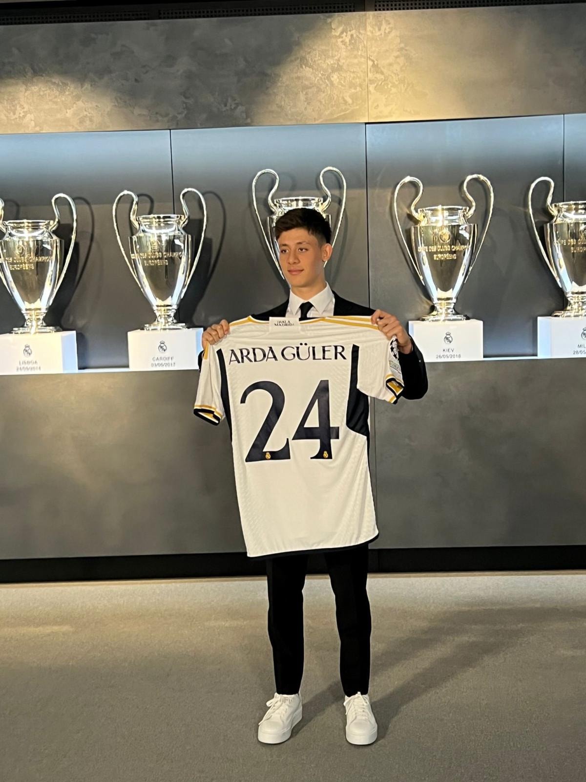 Valdebebas'ta Real Madrid'in Spor Şehri'nde başkan Florentino Perez ile sözleşme imzalayan Arda Güler, 24 numaralı formasıyla poz verdi.