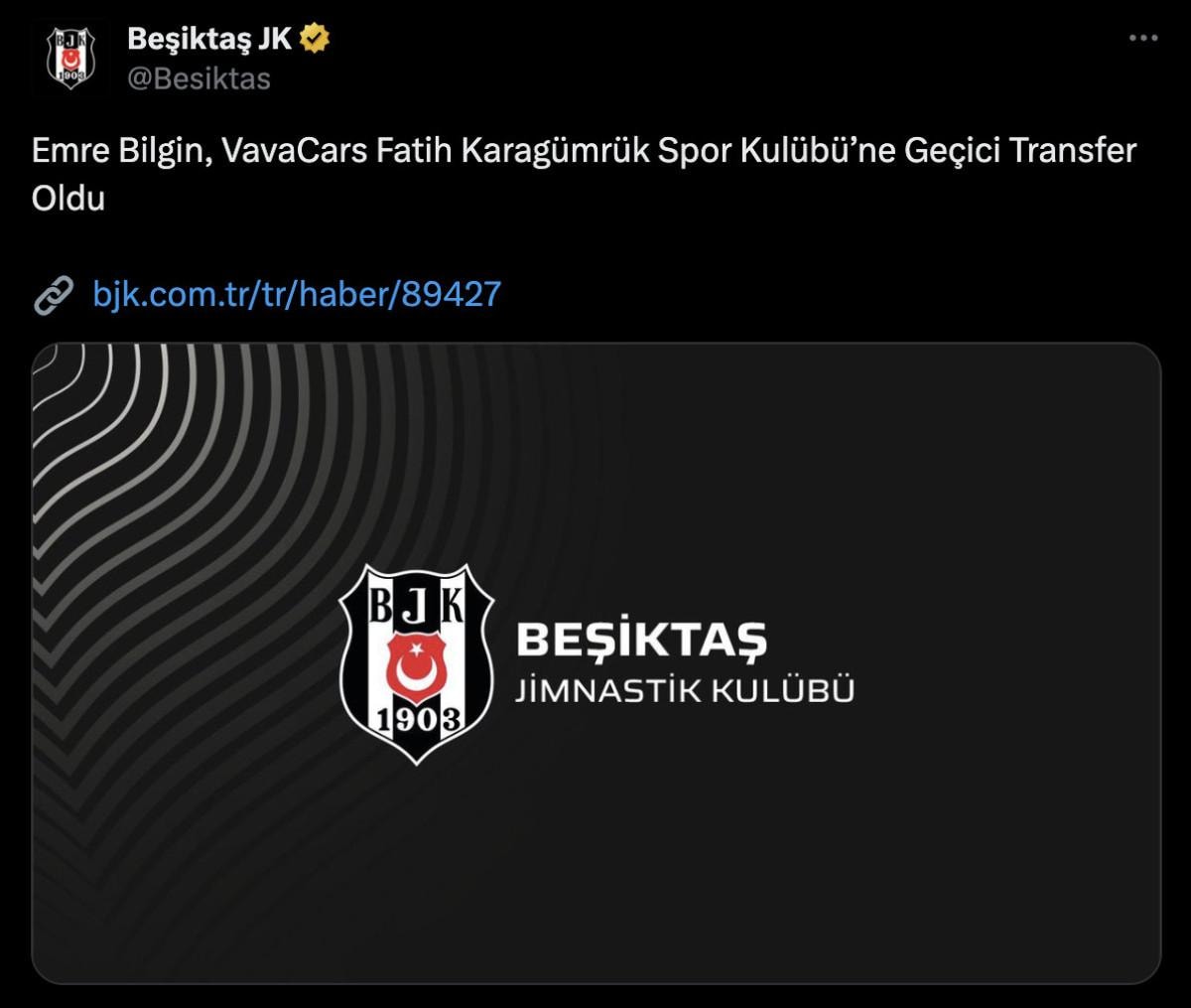 Yeni sezon öncesi kadro yapılandırma çalışmalarına devam eden Beşiktaş, genç file bekçisi Emre Bilgin'in 2024-2025 sezonunun sonuna kadar 1. Lig ekiplerinden Fatih Karagümrük'e kiralandığını açıkladı.