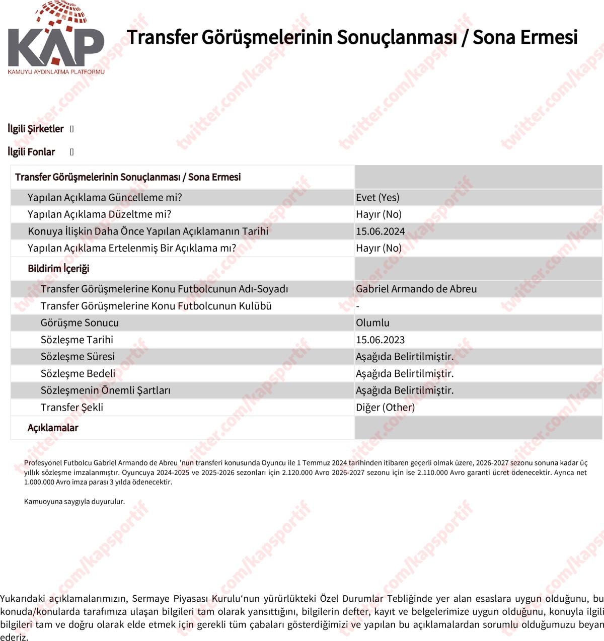 Profesyonel futbolcu Gabriel Armando de Abreu’nun (Paulista) transferi konusunda oyuncu ile 1 Temmuz 2024 tarihinden itibaren geçerli olmak üzere, 2026-2027 sezonu sonuna kadar üç yıllık sözleşme imzalanmıştır. Oyuncuya 2024-2025 ve 2025-2026 sezonları için 2.120.000 Avro 2026-2027 sezonu için ise 2.110.000 Avro garanti ücret ödenecektir. Ayrıca net 1.000.000 Avro imza parası 3 yılda ödenecektir.