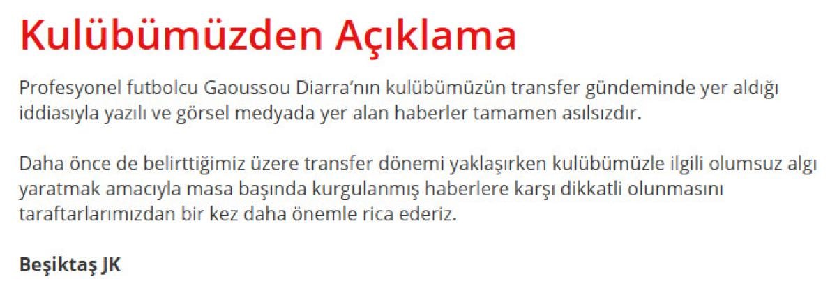 Siyah-beyazlılar, 1. Lig takımı İstanbulspor'un forması giyen Gaoussou Diarra'nın transfer edileceği iddialarıyla ilgili açıklama yaptı.