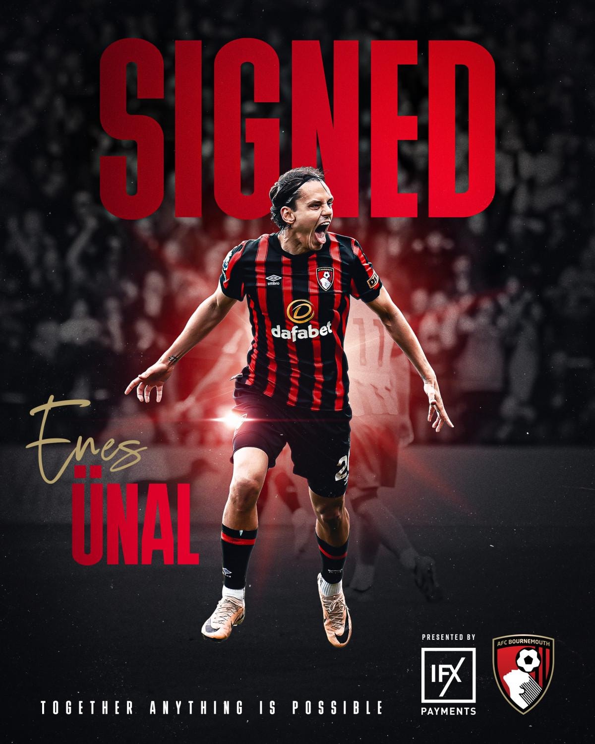 Enes Ünal'ın kalıcı sözleşmeyle AFC Bournemouth'a katıldığını duyurmaktan mutluluk duyuyoruz. Geçtiğimiz birkaç ay boyunca bizimle birlikte olduğu sürede Enes'ten çok etkilendik. Onun çalışma hızı ve tutumu, uzun bir sakatlık rehabilitasyonu döneminin ardından örnek teşkil etti ve başarılı olma arzusu net bir şekilde görüldü. Buradaki oyuncu kadrosuna harika bir katkı sağladığını kanıtladı ve uzun vadeli bir sözleşmeyle aramıza katıldığını doğrulamaktan mutluluk duyuyoruz. Enes'e yaz için en iyisini diliyoruz ve onu Temmuz ayında tekrar ağırlamayı sabırsızlıkla bekliyoruz.
