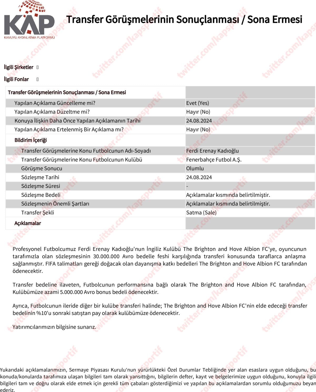 Fenerbahçe, milli oyuncusunun Brighton'a transferini KAP'a bildirdi.