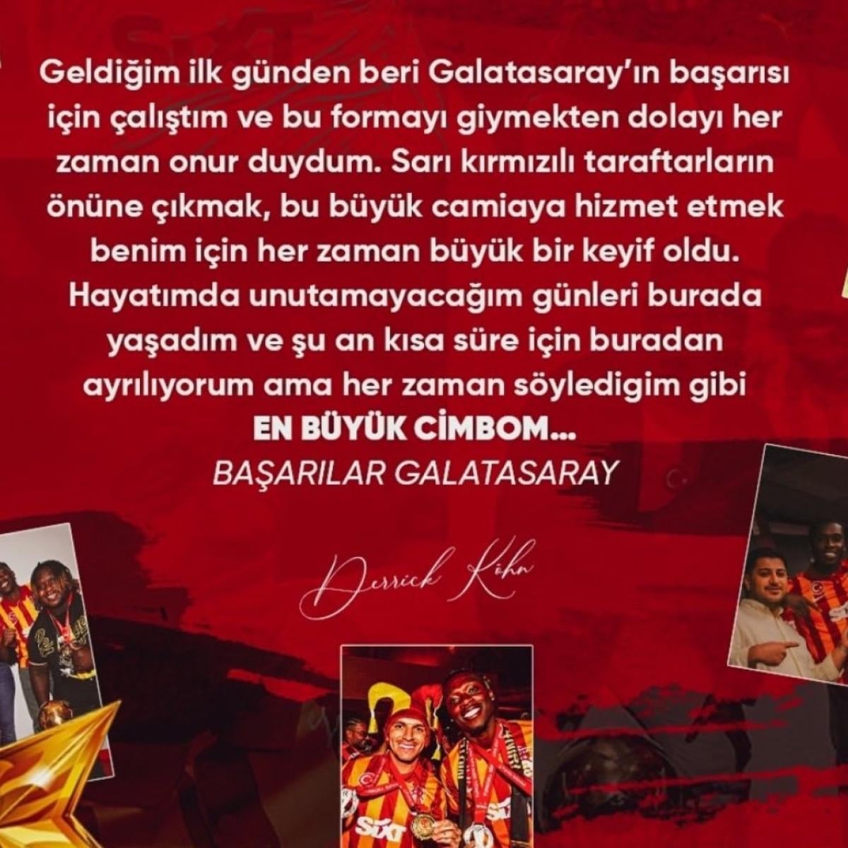 Geldiğim ilk günden beri Galatasaray'ın başarısı için çalıştım ve bu formayı giymekten dolayı her zaman onur duydum. Sarı-kırmızılı taraftarların önüne çıkmak, bu büyük camiaya hizmet etmek benim için her zaman büyük bir keyif oldu. Hayatımda unutamayacağım günleri burada yaşadım ve şu an kısa bir süre için buradan ayrılıyorum. Her zaman söylediğim gibi 'En büyük cimbom.' Başarılar Galatasaray.