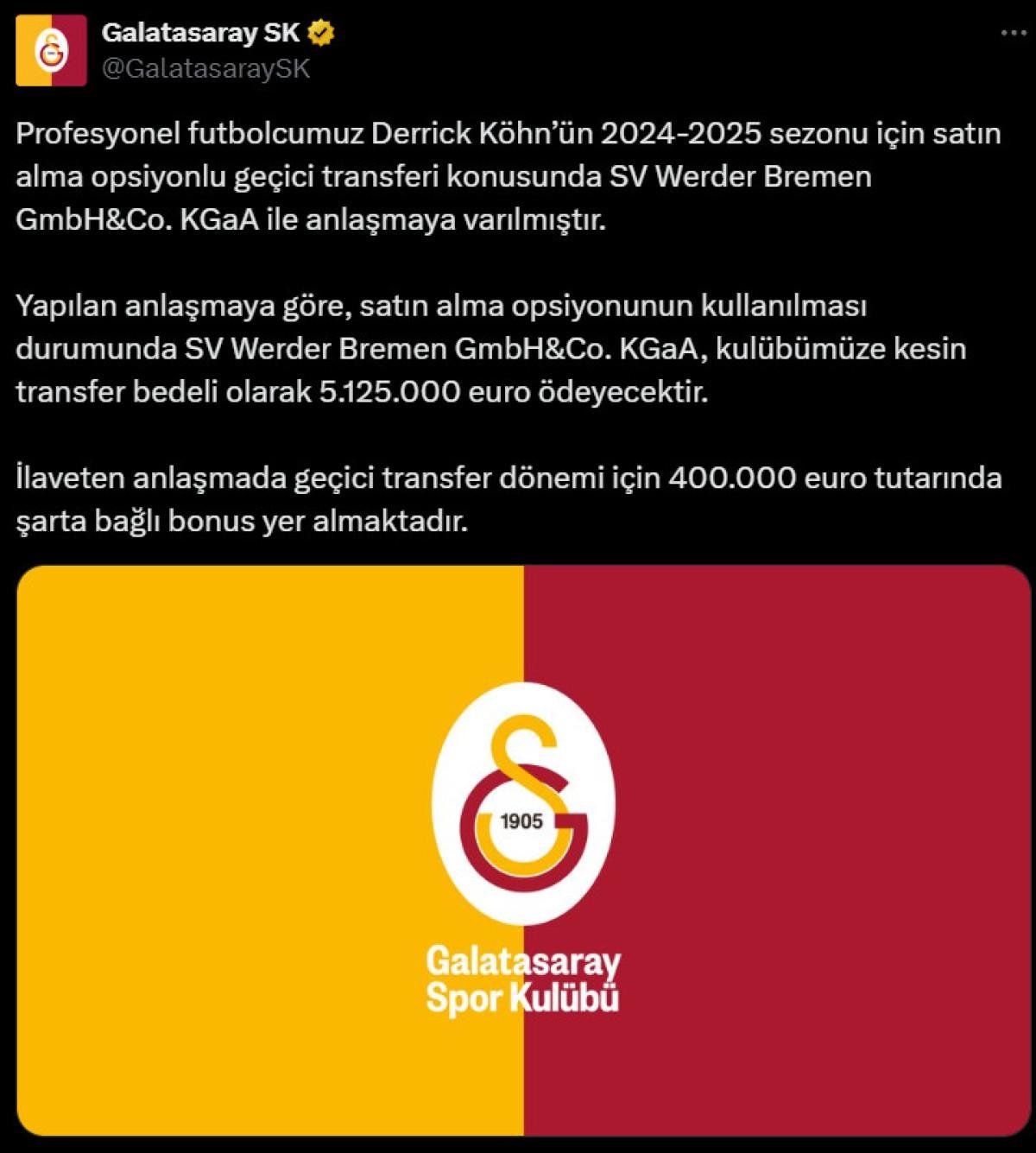 Profesyonel futbolcumuz Derrick Köhn'ün 2024-2025 sezonu için satın alma opsiyonlu geçici transferi konusunda SV Werder Bremen GmbH&Co. KGaA ile anlaşmaya varılmıştır. Yapılan anlaşmaya göre, satın alma opsiyonunun kullanılması durumunda SV Werder Bremen GmbH&Co. KGaA kulübümüze kesin transfer bedeli olarak 5.125.000 euro ödeyecektir. İlaveten anlaşmada geçici transfer dönemi için 400.000 euro tutarında şarta bağlı bonus yer almaktadır.