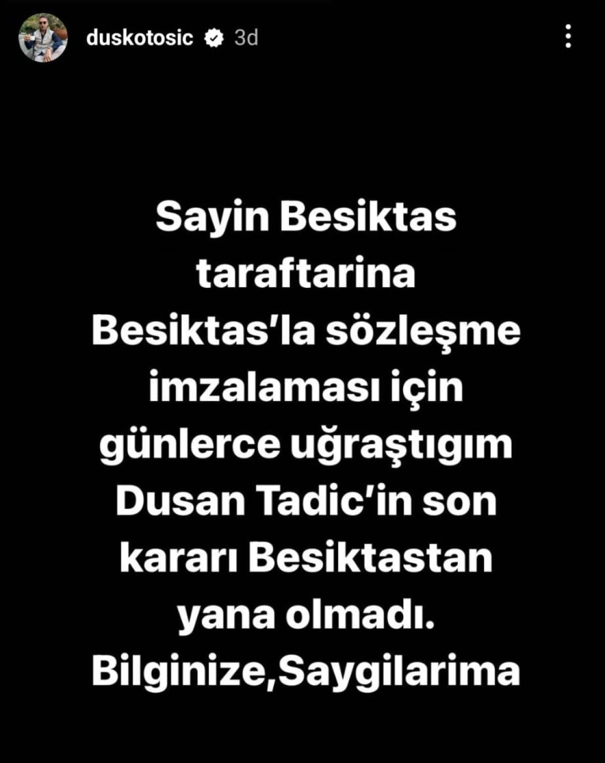 Sayın Beşiktaş taraftarına, Beşiktaş'la sözleşme imzalaması için günlerce uğraştığım Dusan Tadic'in son kararı Beşiktaş olmadı. Bilginize, saygılarımla.