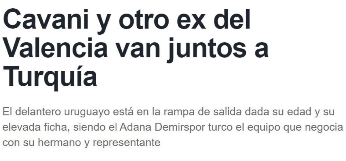 İspanyol Estadio Deportivo'da yer alan habere göre; Adana Demirspor, Cavani'nin kardeşi ve menajeri Nando Guglielmone'ye ilgilerini bildirdi. Valencia, 36 yaşındaki yıldızla kadrosunda yüksek ücretli bir oyuncuyu boşaltmak için ücretsiz olarak ayrılmasına izin verebilir.
