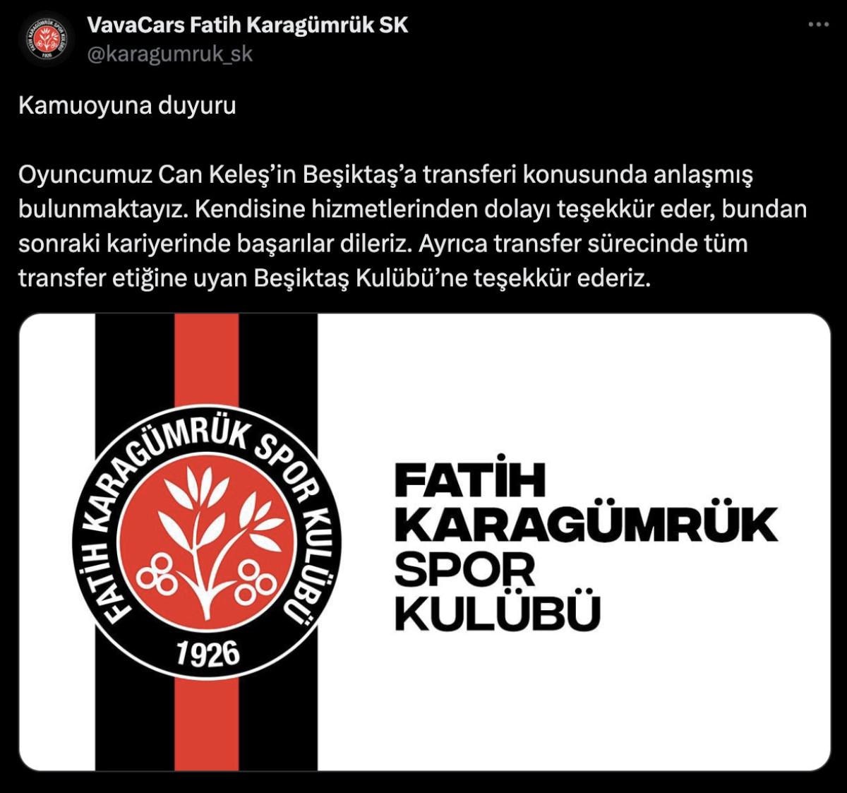 Oyuncumuz Can Keleş’in Beşiktaş’a transferi konusunda anlaşmış bulunmaktayız. Kendisine hizmetlerinden dolayı teşekkür eder, bundan sonraki kariyerinde başarılar dileriz. Ayrıca transfer sürecinde tüm transfer etiğine uyan Beşiktaş Kulübü’ne teşekkür ederiz.