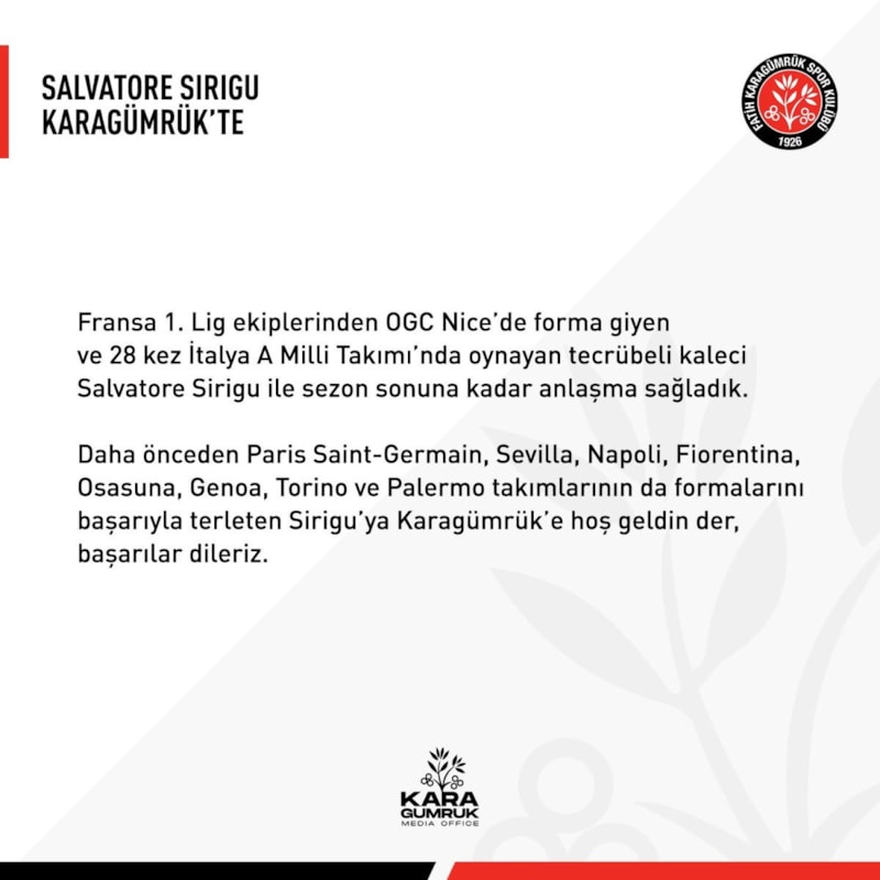 Fransa 1. Lig ekiplerinden OGC Nice'de forma giyen ve 29 kez İtalya A Milli Takımı'nda oynayan tecrübeli kaleci Salvatore Sirigu ile sezon sonuna kadar anlaşma sağladık. Daha önceden PSG, Sevilla, Napoli, Fiorentina, Osasuna, Genoa, Torino ve Palermo takımlarının da formalarını başarıyla terleten Sirigu'ya Karagümrük'e hoş geldin der, başarılar dileriz.