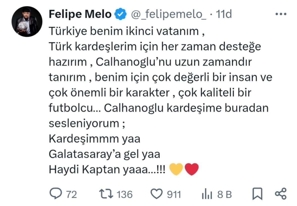 Uzun yıllar Galatasaray forması giyen ve gösterdiği performansla taraftarın sevgilisi haline gelen Felipe Melo, sosyal medyadan paylaşımlarına devam ediyor.