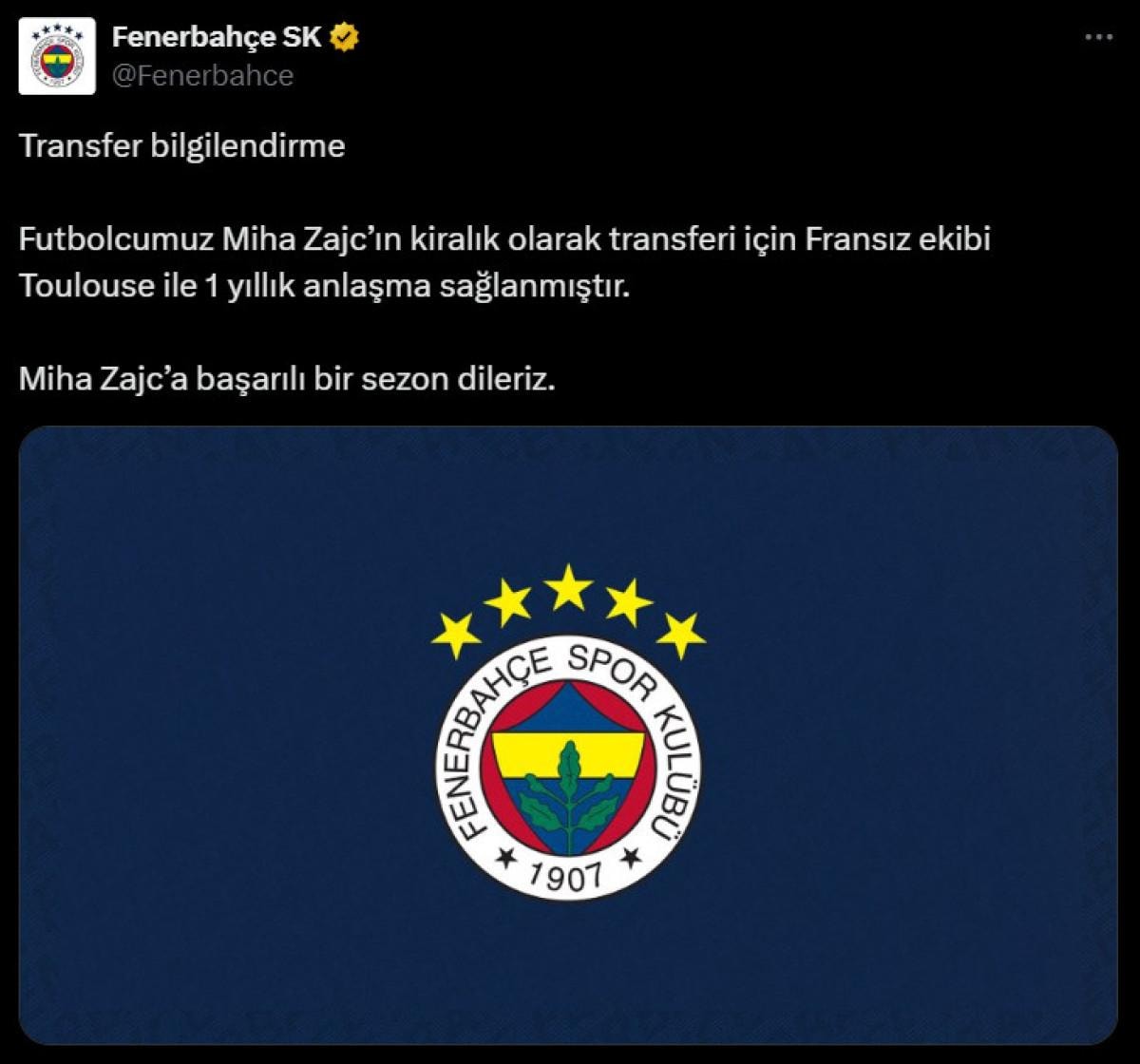 Sarı-lacivertliler, orta saha oyuncusu Miha Zajc'ı daha önce kulüpte sportif direktörlük görevinde bulunan Damien Comolli'nin başkanlığını yaptığı Fransız ekibi Toulouse'a kiraladı.