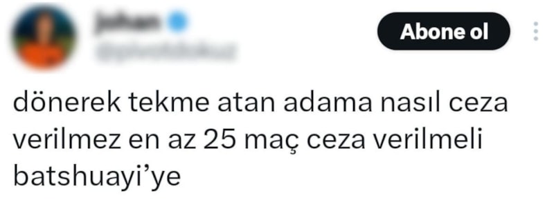 Batshuayi'nin Trabzonspor'la oynanan Süper Lig maçında karıştığı olaylara temas eden bir kullanıcı "Dönerek tekme atan adama nasıl ceza verilmez? En az 25 maç ceza verilmeli Batshuayi’ye" ifadelerini kullandı.