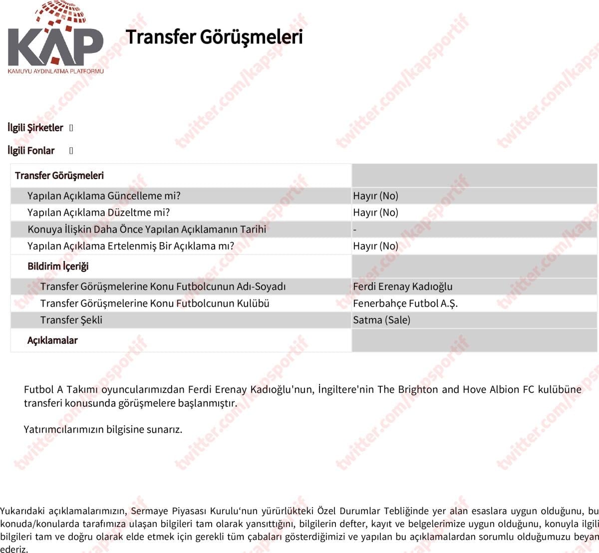 Futbol A Takımı oyuncularımızdan Ferdi Erenay Kadıoğlu'nun, İngiltere'nin The Brighton and Hove Albion FC kulübüne transferi konusunda görüşmelere başlanmıştır.
