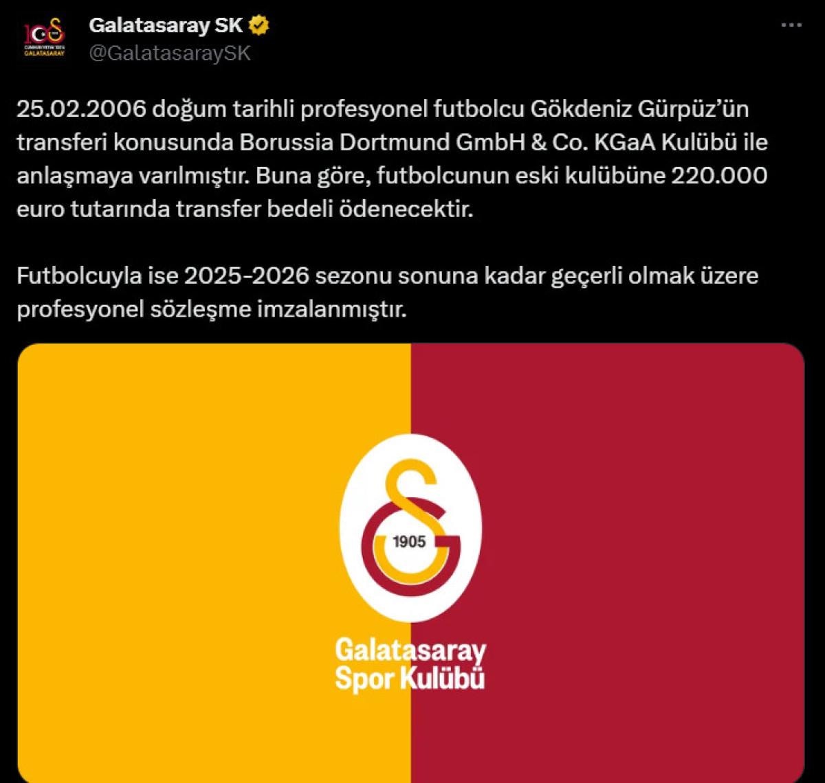 Okan Buruk yönetimindeki Galatasaray, Borussia Dortmund forması giyen Gökdeniz Gürpüz'ü renklerine bağladı.