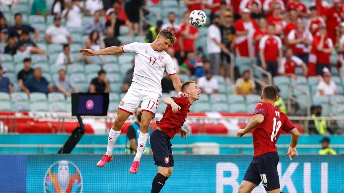 Sarı-kırmızılıların scout ekibinden bir kişi oyuncuyu Çekya-Danimarka maçında yakından takip ediyor.
