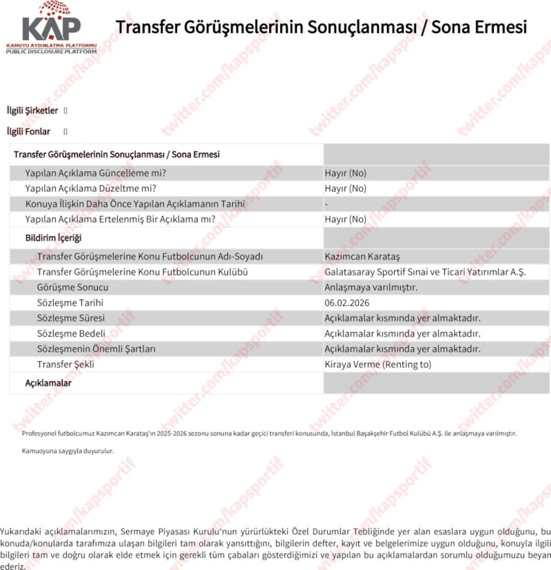 Yaşanan bu gelişmenin ardından Galatasaray, transferi Kamuoyu Aydınlatma Platformu'na (KAP) bildirdi.