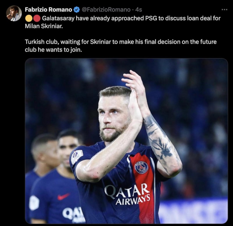 Fabrizio Romano'nun haberine göre; Galatasaray, Skriniar'ın kiralık olarak transferi için PSG'ye başvurdu.