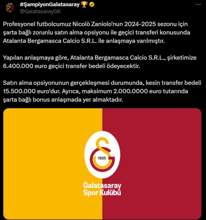 Profesyonel futbolcumuz Nicolo Zaniolo'nun 2024-2025 sezonu için şarta bağlı zorunlu satın alma opsiyonu ile geçici transferi konusunda Atalanta Bergamasca Calcio S.R.L. ile anlaşmaya varılmıştır.