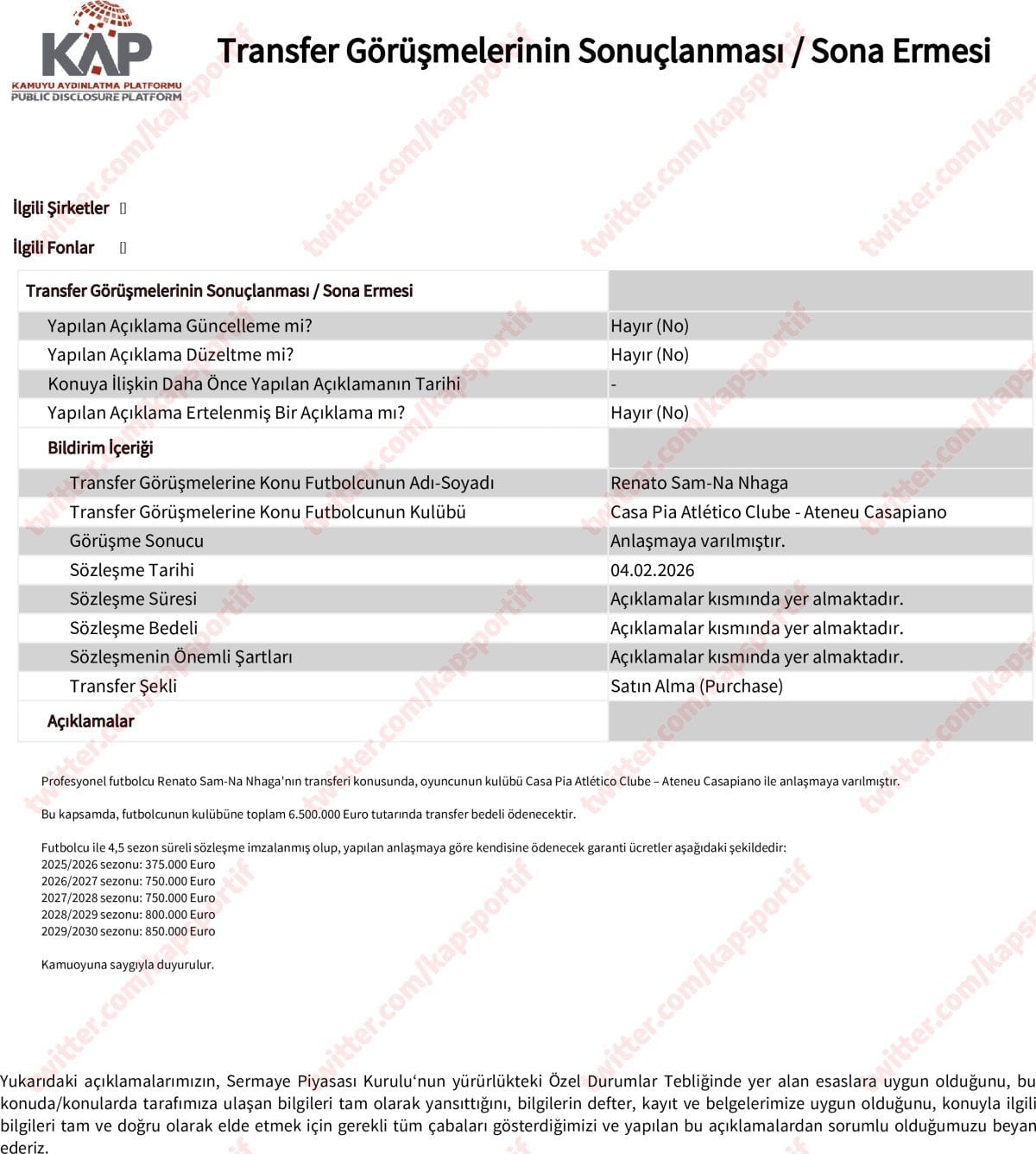 Profesyonel futbolcu Renato Sam-Na Nhaga'nın transferi konusunda, oyuncunun kulübü Casa Pia Atletico Clube-Ateneu Casapiano ile anlaşmaya varılmıştır. Bu kapsamda, futbolcunun kulübüne toplam 6,5 milyon avro tutarında transfer bedeli ödenecektir.