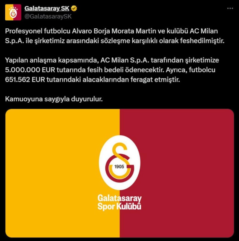 Galatasaray, Alvaro Morata'nın Milan'dan kiralık olarak devam eden sözleşmesini feshettiğini resmi olarak duyurdu. Galatasaray, bu fesih karşılığında 5 milyon euro tazminat bedeli aldı.