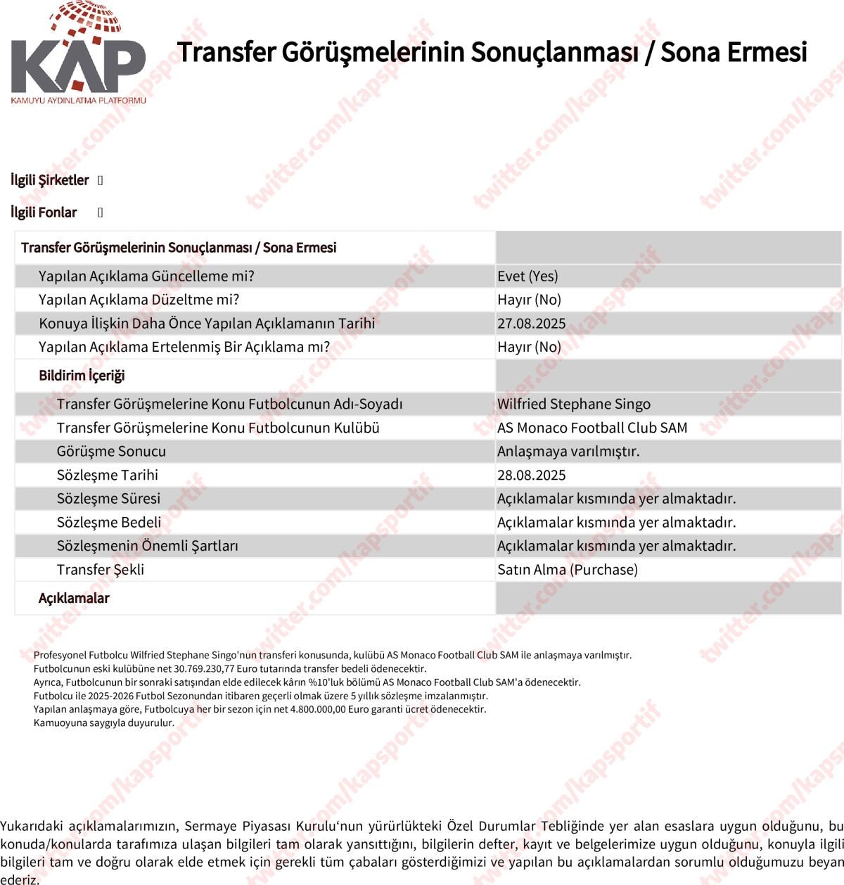 Profesyonel futbolcu Wilfried Stephane Singo'nun transferi konusunda, kulübü AS Monaco Football Club SAM ile anlaşmaya varılmıştır.