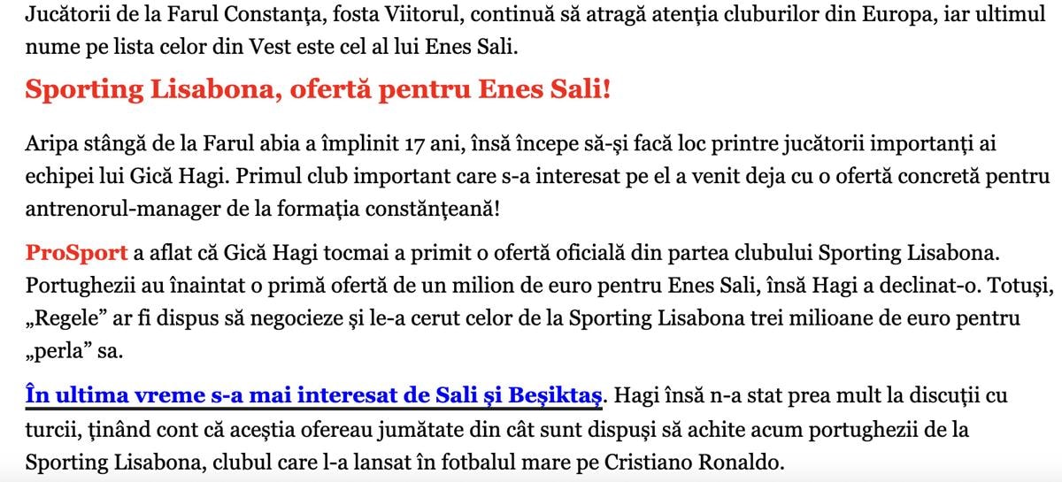 Rumen yayın organı ProSport'un haberine göre; Portekiz'in Sporting Lizbon takımı, Enes için resmi bir transfer teklifinde bulundu. Sporting, Enes Sali'yi kadrosuna katmak için Farul Constanta'ya 1 milyon euro teklif etti ancak Hagi bu teklifi reddederek 3 milyon euro istedi.