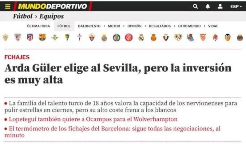 Mundo Deportivo'nun haberine göre; Arda Güler'in yetiştiriciliği ile ünlü olan İspanyol devi Sevilla'ya transfer olmayı seçtiği ifade edildi. Haberde Benfica, Barcelona, Real Madrid gibi ekiplerden çok daha önce Arda ile ilgilenen Sevilla'nın oyuncuyu ikna ettiği iddiası okuyuculara aktarıldı.