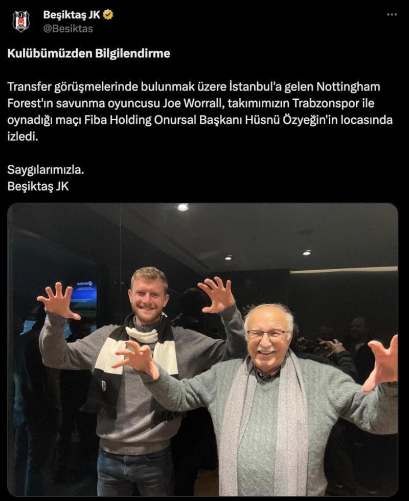Beşiktaş, Nottingham Forest'tan Joe Worrall ile görüşemelere başlandığını duyurdu. 27 yaşındaki isim, akşam saatlerinde İstanbul'a gelerek Beşiktaş - Trabzonspor maçını tribünden izledi.