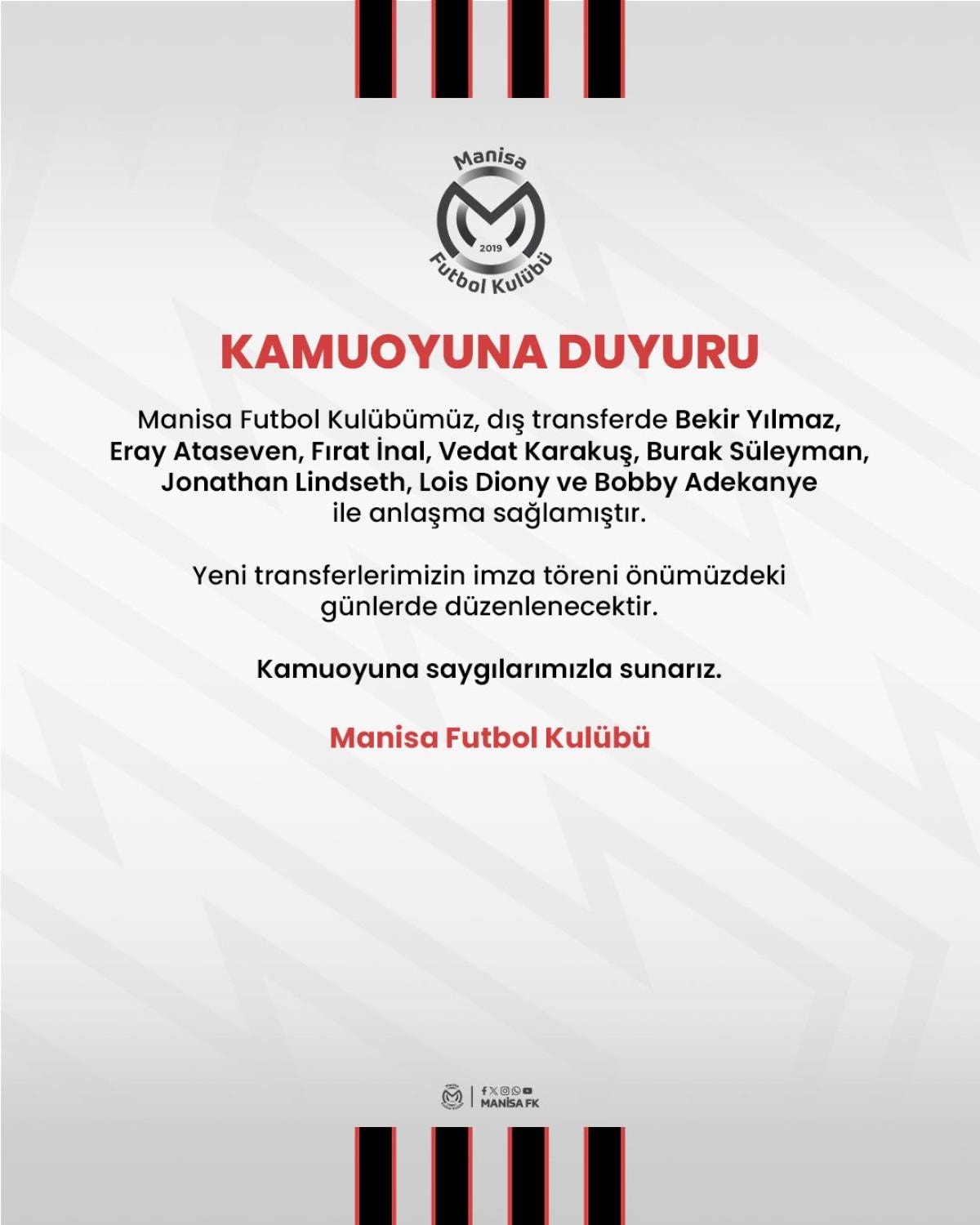 1. Lig ekiplerinden Manisa Futbol Kulübü, yeni sezon öncesi kadrosunu güçlendirmek amacıyla dış transferde 8 oyuncuyla anlaşma sağladı.