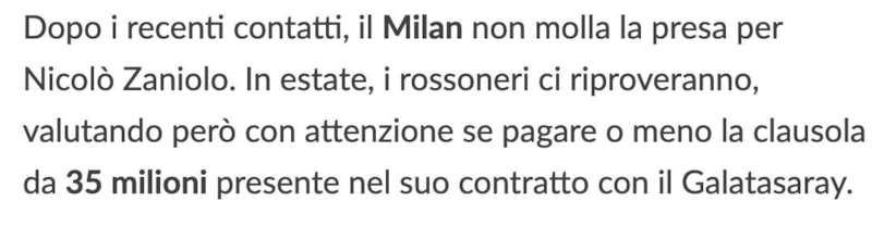 Serie A ekibi Milan'ın Zaniolo'nun Galatasaray'daki performansına göre hareket edeceği belirtilirken, futbolcunun durumuna göre 35 milyon euroluk serbest kalma maddesini ödeyebileceği aktarıldı.
