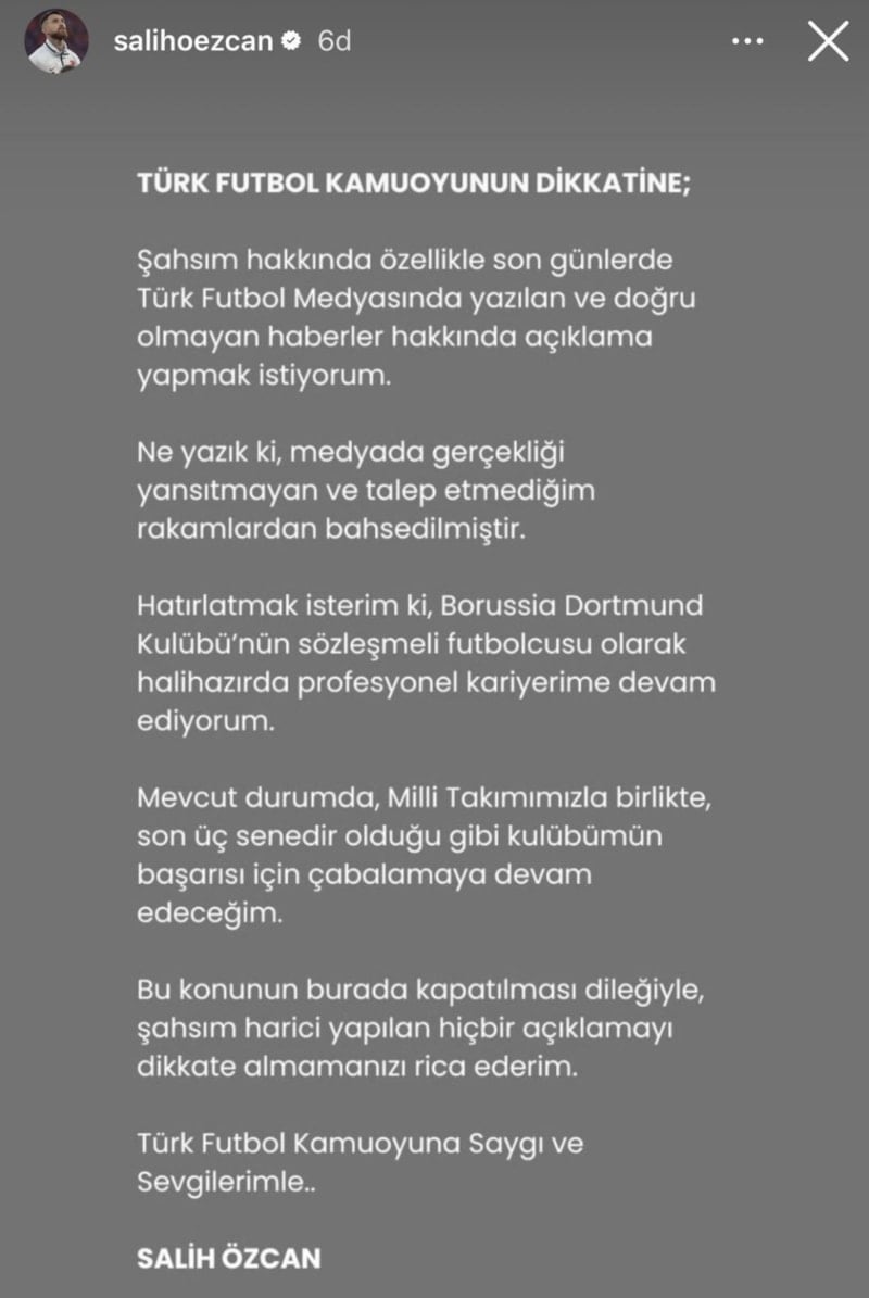 Alman devi Borussia Dortmund'un formasını giyen Salih Özcan, sosyal medya hesabından dikkat çeken bir açıklama yaptı.