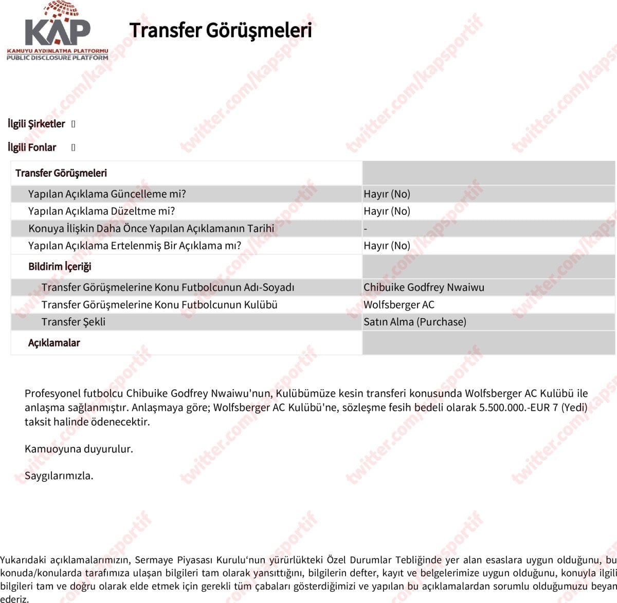 Trabzonspor Sportif Yatırım ve Futbol İşletmeciliği Ticaret AŞ'den Borsa İstanbul'a gönderilen ve Kamuyu Aydınlatma Platformunda da (KAP) yer alan açıklamada, Chibuike Godfrey Nwaiwu'nun bordo-mavili kulübe kesin transferi konusunda Wolfsberger AC Kulübü ile anlaşma sağlandığı belirtildi.