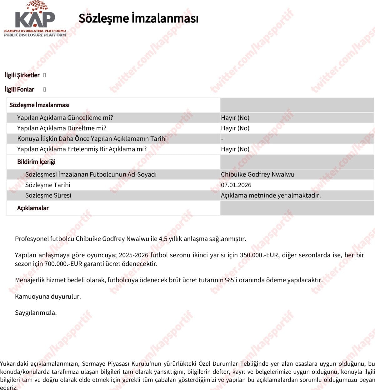 Profesyonel futbolcu Chibuike Godfrey Nwaiwu ile 4,5 yıllık anlaşma sağlanmıştır. Yapılan anlaşmaya göre oyuncuya 2025-2026 futbol sezonu ikinci yarısı için 350 bin euro, diğer sezonlarda ise her bir sezon için 700 bin euro garanti ücret ödenecektir. Menajerlik hizmet bedeli olarak, futbolcuya ödenecek brüt ücret tutarının yüzde 5'i oranında ödeme yapılacaktır.