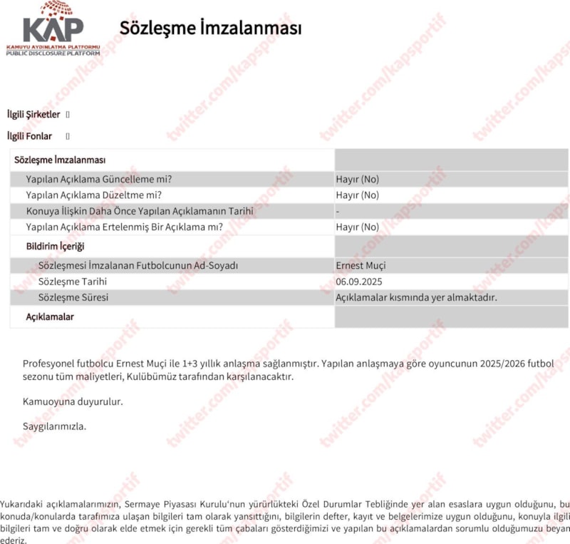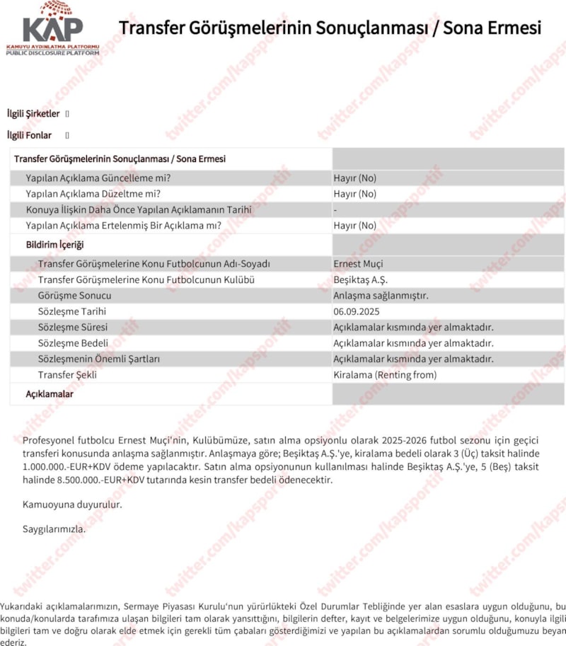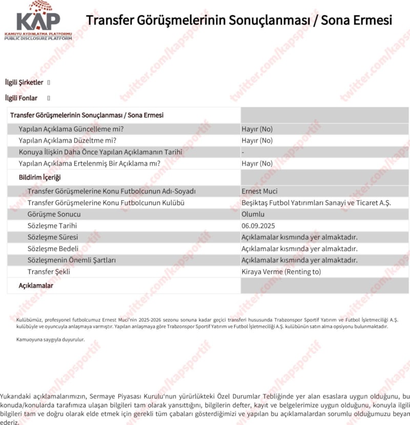 Kulübümüz, profesyonel futbolcumuz Ernest Muçi'nin 2025-2026 sezonu sonuna kadar geçici transferi hususunda Trabzonspor Sportif Yatırım ve Futbol İşletmeciliği A.Ş. kulübüyle ve oyuncuyla anlaşmaya varmıştır. Yapılan anlaşmaya göre Trabzonspor Sportif Yatırım ve Futbol İşletmeciliği A.Ş. kulübünün satın alma opsiyonu bulunmaktadır.