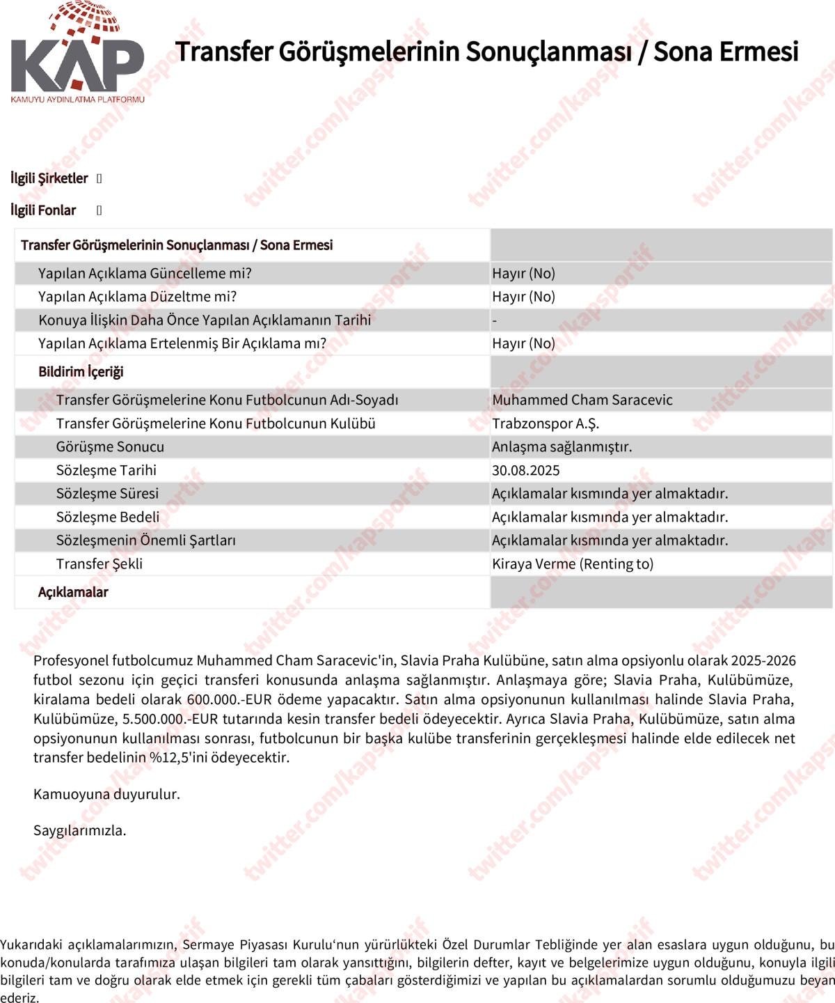 Profesyonel futbolcumuz Muhammed Cham Saracevic'in, Slavia Prag Kulübüne, satın alma opsiyonlu olarak 2025-2026 futbol sezonu için geçici transferi konusunda anlaşma sağlanmıştır.