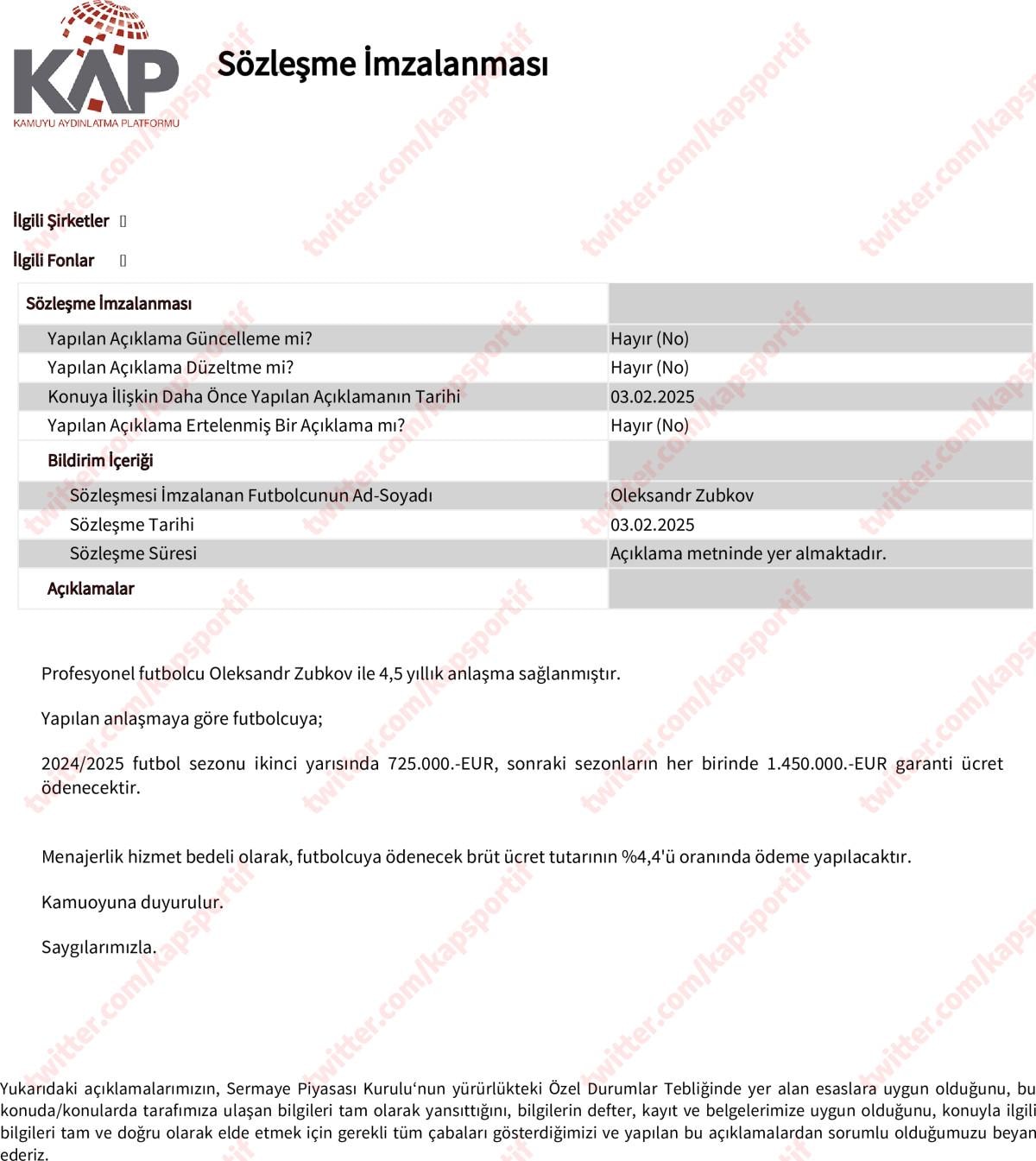 Kulüpten yapılan açıklamada bonservis bedeli olarak 6 milyon euro ödeneceği, 4.5 yıllık sözleşme imzalanan Oleksandr Zubkov'a ise yıllık 1.45 milyon euro maaş ödeneceği ifade edildi.