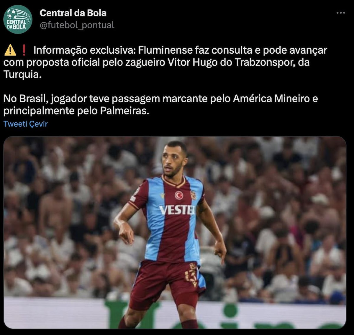 Central da Bola'nın duyurduğu habere göre; Fluminense kulübü Breziyalı savunmacı Vitor Hugo ile sözleşme imzalamaya yakın.