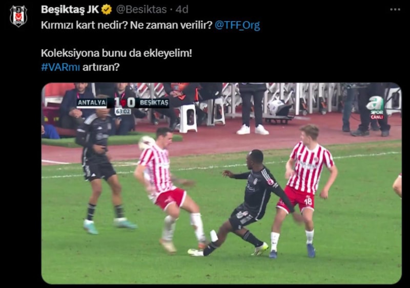 Müsabakanın 63. dakikasında Antalyasporlu futbolcu Dario Saric ile Jackson Muleka arasında pozisyona kırmızı kart çıkması gerektiğini belirten paylaşımda şu ifadeler kullanıldı: