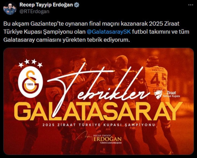 Cumhurbaşkanı Recep Tayyip Erdoğan, sosyal medya hesabından yayımladığı mesajda, "Bu akşam Gaziantep’te oynanan final maçını kazanarak 2025 Ziraat Türkiye Kupası Şampiyonu olan Galatasaray futbol takımını ve tüm Galatasaray camiasını yürekten tebrik ediyorum" dedi.