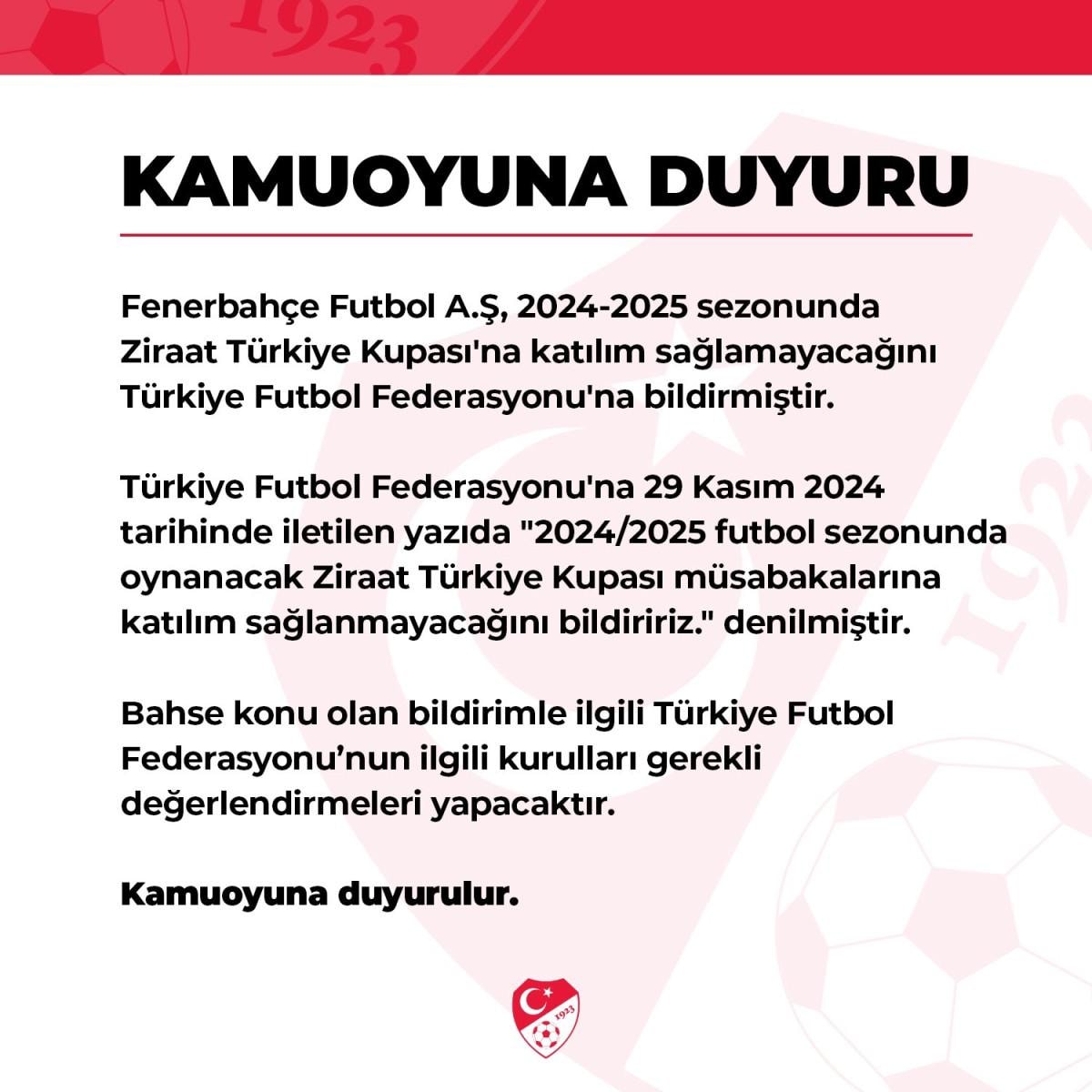 Türkiye Futbol Federasyonu, Fenerbahçe'nin 2024-2025 sezonunda Türkiye Kupası'na katılmayacağını federasyona bildirdiğini duyurdu.