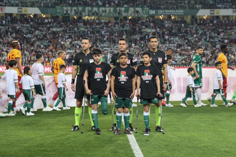 Konyaspor ile Galatasaray arasında oynanan Türkiye Kupası yarı final maçında Filistin'e destek için Gazzeli çocuklar futbolcularla birlikte seremoniye çıktı.