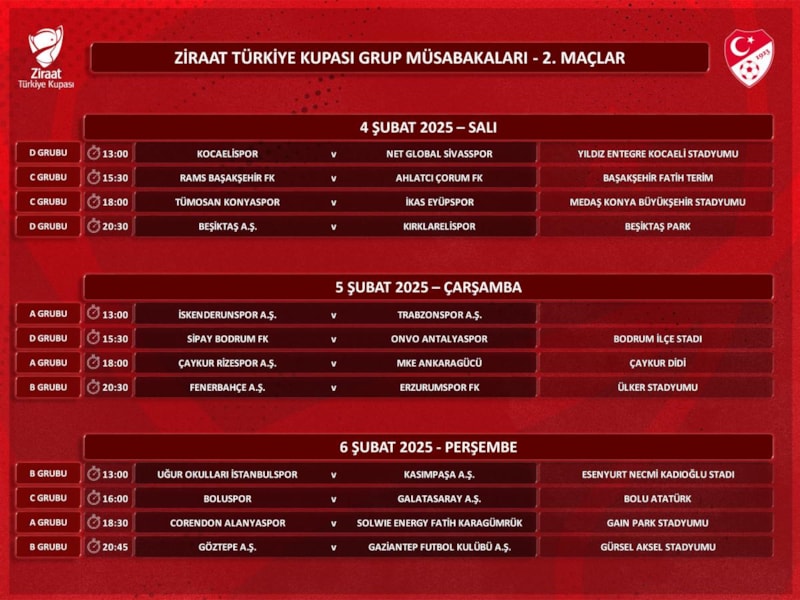 Türkiye Futbol Federasyonu (TFF), Türkiye Kupası'nda grup aşaması ikinci maçlarının programını duyurdu.