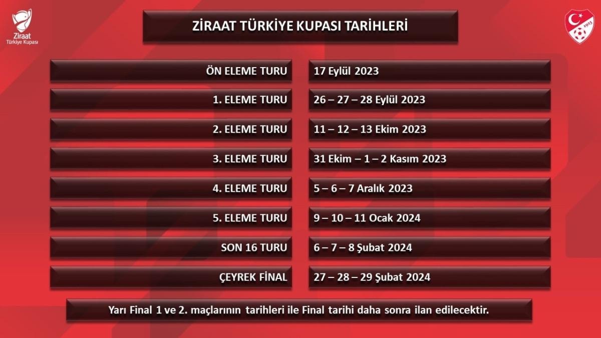 Türkiye Futbol Federasyonu tarafından yapılan açıklamaya göre Türkiye Kupası'nda ön eleme turu 17 Eylül 2023'te, 1. eleme turu 26-27-28 Eylül 2023'te, 2. eleme turu 11-12-13 Ekim 2023'te, 3. eleme turu 31 Ekim-1-2 Kasım 2023'te, 4. eleme turu 5-6-7 Aralık 2023'te, 5. eleme turu 9-10-11 Ocak 2024'te, son 16 turu 6-7-8 Şubat 2024'te, çeyrek final müsabakaları ise 27-28-29 Şubat 2024'te oynanacak.